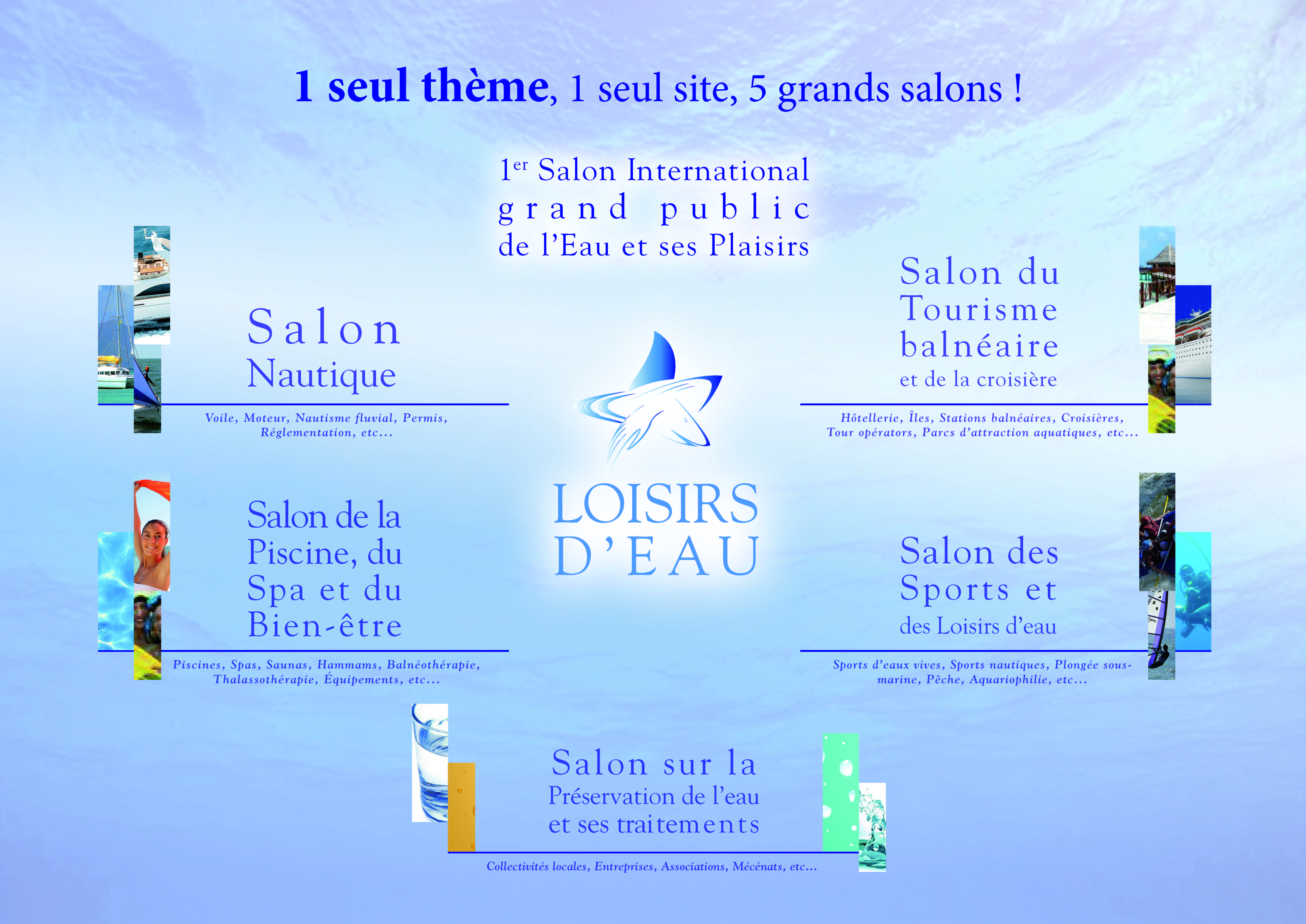 Nautisme, sports et loisirs, piscine et spa, thalassothérapie et bien-être, sans oublier le tourisme balnéaire et la croisière : c'est à un tour d'horizon complet de l'eau, douce ou salée mais toujours source de vitalité et océan de sensations, que vous invite Loisirs d'Eau.